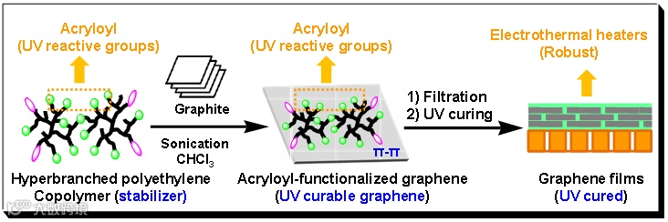 浙江工业大学徐立新教授课题组长期从事功能性超支化聚合物的设计合成及其应用研究。近年来,该课题组利用Pd-diimine催化剂独特的链行走聚合机理,在温和条件下通过催化乙烯和各类功能单体共聚,并与ATRP等可控聚合手段相结合,已设计合成一系列多功能型超支化聚乙烯及其共聚物。研究发现,以该类超支化聚合物作为分散稳定助剂,不仅可有效促进天然石墨在各类普通低沸点溶剂中高效剥离,同时可通过非共价CH-π、π-π等作用稳固吸附于所得石墨烯表面,使其同步实现非共价功能化修饰。课题组利用所得石墨烯与UHMWPE、HDPE、含氟共聚物、环氧树脂、PDMS、EVA等聚合物基体复合,已成功制得系列聚合物基石墨烯纳米复合材料,获得显著提高的介电、导电、导热、耐磨等性能(Carbon, 2018, 136, 417; J. Mater. Chem. C, 2018, 6, 11144; Polymer, 2018, 145, 391; Nanotechnology, 2020, 31, 165703; Nanotechnology, 2019, 30, 355602; Soft Matter, 2019, 15, 9224; Energy Technol., 2019, 7, 1900023; Macromol. Chem. Phys., 2019, 1800577; J. Phys. Chem. C, 2013, 117, 10730; Chem. Commun., 2013, 49, 8800; Chem. Commun., 2013, 49, 6235; 高分子学报, 2014, 7, 1002)。为促进所得石墨烯在柔性电热材料领域的应用,该课题组在最近研究中,通过在超支化聚乙烯结构中同时引入UV反应基团和芘基,设计合成了超支化聚乙烯三元共聚物,发现其不仅可有效促进天然石墨在THF、氯仿、乙醚等普通低沸点溶剂中高效剥离,而且可将UV反应基团同步引入所得石墨烯表面,通过抽滤和UV辐照,即可获得高稳固石墨烯柔性电热涂层(图1)。