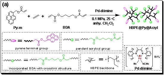 首先利用Pd-diimine催化剂催化乙烯、含芘单体(Py-m)和1,4-丁二醇二丙烯酸酯(BDA)共聚,在1 atm、25 °C下以一锅法工艺获得超支化聚乙烯共聚物(HBPE@Py@Acryl)(图2)。通过1H NMR、GPC、熔融流变测试共同表明:该共聚物由近似球形的超支化聚乙烯骨架(支链密度88/1000 C)和芘端基(1.8/molecule)、丙烯酰基(18.0/molecule)共同构成。由于其超支化结构,该共聚物室温下可溶解于THF、氯仿、甲苯、乙醚等系列普通有机溶剂中。进一步发现,所得HBPE@Py@Acryl借助超声可有效促进天然石墨在THF、氯仿、二氯甲烷、乙醚等普通低沸点溶剂中高效剥离,获得稳定的石墨烯分散液。通过工艺调节,石墨烯分散浓度可达1.7 mg mL-1,剥离效率达21%。HRTEM、AFM、Raman、XPS等表征共同显示,所得石墨烯结构完整,厚度主要为2至3层,比例达93%(图3)。同时,通过TGA、荧光光谱分析表明,所得共聚物可与石墨烯表面发生π-π作用,使其稳固吸附于所得石墨烯表面,从而将该共聚物结构中的丙烯酰基间接引入石墨烯表面,比例达0.83 mmol G-1。