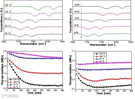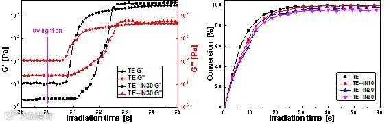 图2 (a) G' and G'' during in situ rheological test; (b) real-time infrared spectra (FTIR) of TE–IN samples