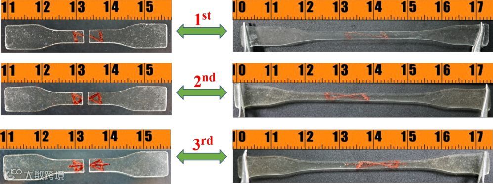 通过变温红外(VT-IR)、动态热机械分析(DMA)及应力松弛行为验证了弹性体优异的动态可逆性(图3)。通过弹性体中离子键的动态解离和重组,可将有机硅弹性体的断裂面有效修复,修复效率可达97%以上,且多次修复后,修复效率仍可达92%以上(图4和图5)。此外,制备的双交联有机硅弹性体具有优异的回收性能,回收后弹性体拉伸强度可恢复90%以上,多次回收后拉伸强度仍可恢复85% 以上。回收后弹性体仍具有优异的自修复性能,多次修复后修复效率仍可达90%以上(图6)。