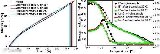 图5 (a) Repeated macro-repairing of damaged TE–IN10 samples. Stress-strain curves of virgin and self-healed silicone elastomers, (b) epeatedly healed TE–IN10 samples, (c) TE–IN10, TE–IN20 and TE–IN30 samples healed at 100 °C for 12 h.