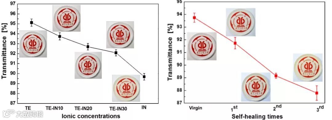 制备的双交联有机硅弹性体具有优异的透明度。随着离子网络含量的增加,可见光透光率仍可达90%以上,多次高温热修复及回收后,可见光透光率仍可高达85%以上(图7)。弹性体具有优异的抗水解性能,即使80 ℃热水处理48h,弹性体的力学性能、E'和Tg均无明显降低,此外,经80 ℃热水处理48h,弹性体试样仍具有高达90 %以上的修复效率(图7)。