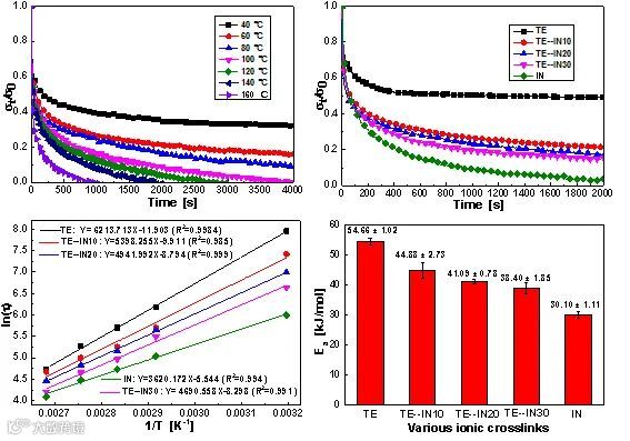 图3 VT-IR spectra of TE–IN10, (a) peak shift as heated from 40 to 120 °C by 10 °C/min, (b) peak shift during cooled from 120 to 40 °C by 10 °C/min. Variation of storage modulus E´ under various temperatures as a function of time, (c) IN samples, (d) TE–IN10 samples. Normalized stress-relaxation curves, (g) TE–IN10 samples under different temperatures and (h) elastomers containing various ionic bonds at 60 °C, (c) Linear fitting of relaxation time (τ) versus temperature according to the Arrhenius' equation, (d) Stress relaxation activation energy (Ea) of samples with various ionic bonds.