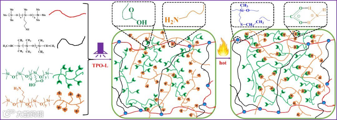刘晓暄教授团队通过PDMS–SH与端乙烯硅油的光诱导点击反应及羧基硅油与氨基硅油的热可逆动态离子交联构建的可逆/不可逆杂化双网络,制备出一种可快速UV固化及优异自修复性的有机硅透明弹性体。并将其应用于3D打印上,打印出具有优异多重自修复性能的有机硅弹性体实体。制备的光-热双交联有机硅弹性体的固化机理及交联网络示意图(图1)。