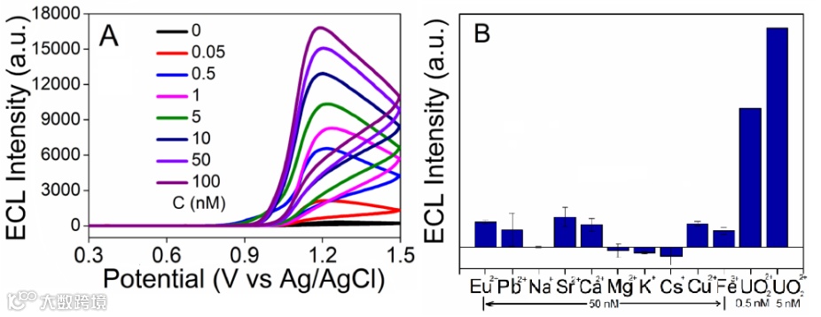 图4.(A)不同浓度UO22+存在下Pdots的ECL强度;(B)Pdots对UO22+的选择性。(Copyright 2020, Copyright 2020, Wiley Online Library.)