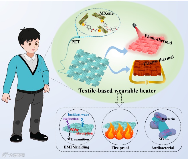 近日,郑州大学王建峰副教授与王万杰教授团队采用溶液浸渍法,成功制备了兼具阻燃、抗菌、电磁屏蔽功能的电/光双驱动聚合物/MXene(M-textile)复合织物加热器。MXene纳米片在氢键作用和物理插入的双重作用下紧密的包覆在聚合物纤维表面,并保持了原始织物良好的透气性和舒适性。在MXene含量为17.3 wt%时,M-textile织物的电导率达到117 S/m,在1~3.5 V的低驱动电压下可实现40~174 °C的宽加热范围,且具有优异的耐久性、耐用性和加热稳定性,在长时间循环、大形变及水洗后,依然保持良好的电热性能。而且,M-textile织物在不同波长(近红外光、远红外光、自然光)光源照射下呈现出快速、灵敏的光热转换效果,其加热温度范围可达40~204 °C,并在水洗、大变形、长时间加热后依然保持良好的光热转换效果。与此同时,M-textile基可穿戴加热器还具有优异的电磁屏蔽(42.1 dB,X波段)、阻燃和抗菌性能。该文为实现复杂条件下快速、安全、灵敏的热量转换提供了可行性和新的思路,制得的M-textile加热器在保温、热疗、除冰、防火和抗菌等方面具有巨大应用价值。该研究近日以题目“Air-permeable, multifunctional, dual-energy-driven MXene-decorated polymeric textile-based wearable heater with exceptional electrothermal and photothermal conversion performance”发表在Journal of Materials Chemistry A上(2020, doi.org/10.1039/D0TA03048A)。
