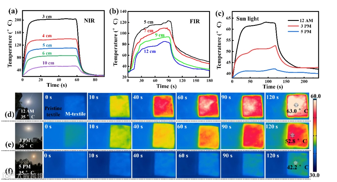图10. M-textile基可穿戴加热器在近红外光(a)、远红外光(b)和太阳光(c-f)照射下的光热转换性能。