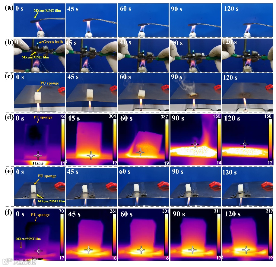 图5. MXene/MMT复合薄膜的耐热、耐火及隔热性能。