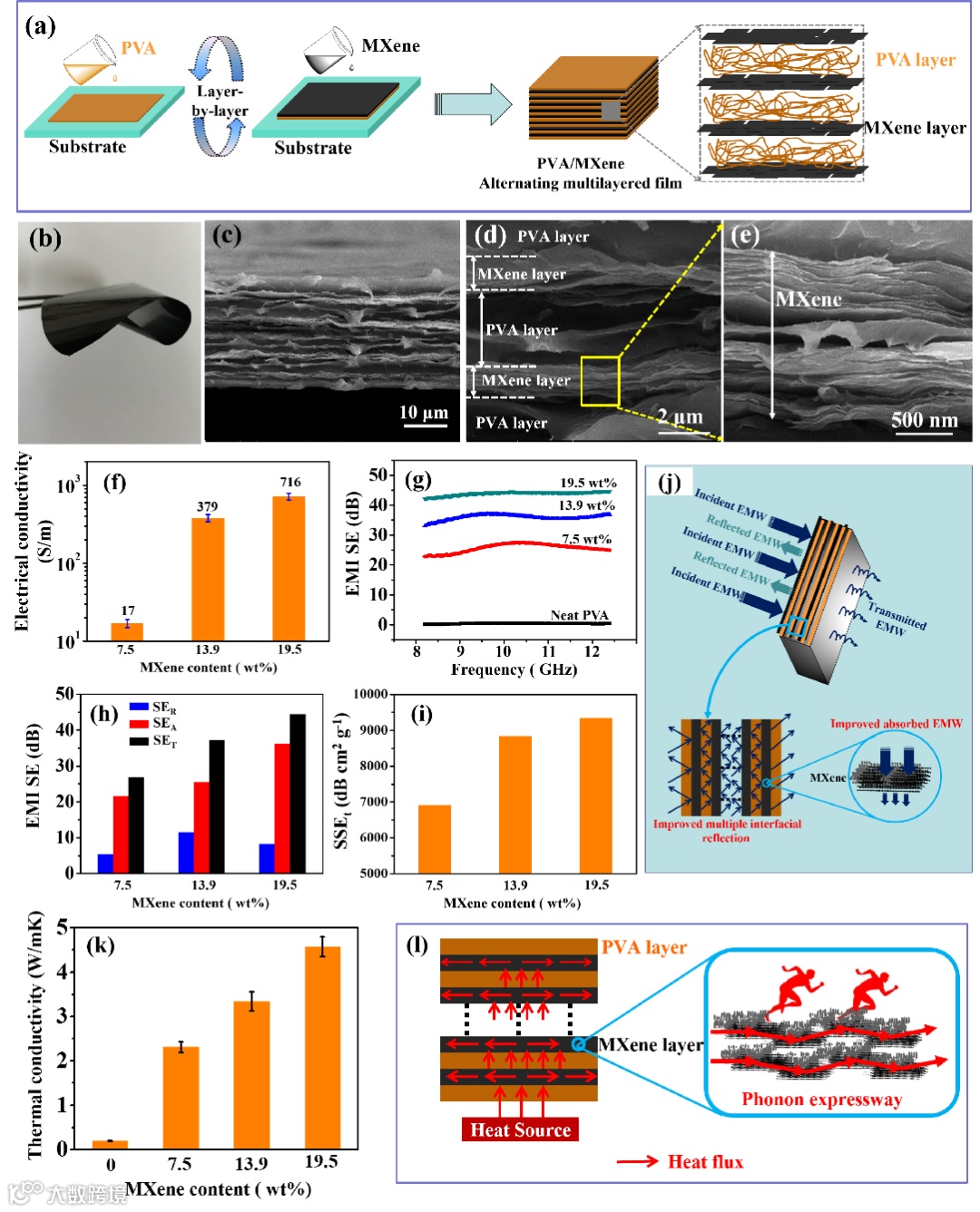 图2. 阻燃、高导电、高导热的聚乙烯醇/MXene交替多层复合电磁屏蔽薄膜。