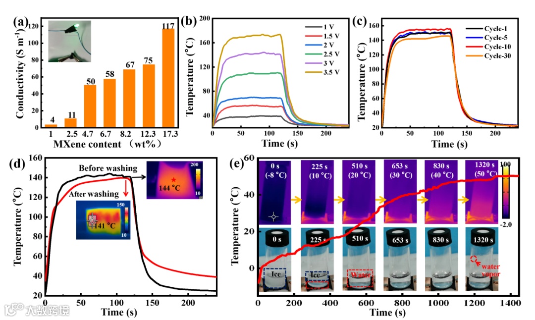 图6. MXene/MMT复合薄膜的电热转换及电热除冰性能。