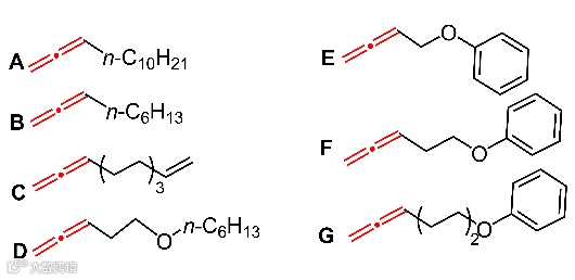 作者首先合成出系列结构不同的催化剂,研究联烯的区域选择性聚合,筛选出活性和选择性最好的催化体系3。在各种聚合条件下,研究催化体系3对含有不同取代基团的联烯单体聚合行为(图1,2)。结果表明,单体中烷基链的长短对聚合行为影响不大;末端为双键的烷基联烯聚合时,末端双键不参与聚合,说明累积双键的活性比单双键高。因此,单体A、B和C可以进行高活性及完美的1,2-选择性聚合(1,2-selectivity >99%)。当单体中含有极性烷氧基团时,催化体系的活性种被双键和氧原子共同螯合而失活,故单体D不能发生聚合。采用苯环保护氧原子的策略,作者进行单体E、F和G的聚合行为研究。由于单体E与中心金属配位时发生异构化,同样不发生聚合。累积双键和氧原子间隔两个碳原子的单体F能够进行聚合,但因为苯氧基团和累积双键距离较近而造成拥挤的配位环境,很大程度上影响其聚合速率和区域选择性(在同样条件下聚合96h,单体转化率为42%,1,2-选择性仅为13%)。相比之下,单体G中的氧原子远离累积双键,又受到苯环的保护,实现较高的转化率和完美的1,2-选择性聚合。