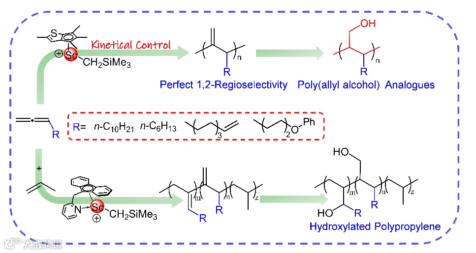 最近,中科院长春应化所崔冬梅研究员课题组通过催化剂设计成功实现反常规的联烯单体高1,2-区域选择性聚合,并在此基础上实现了丙烯与联烯共聚。将得到的均聚物和共聚物中高活性的端双键羟基化,分别得到聚烯丙醇类似物和羟基含量高达26.5mol%的聚丙烯。机理研究表明联烯完美的1,2-选择性聚合是动力学驱动而非热力学控制过程。