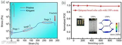 图2 基于剪纸结构的可拉伸太阳电池(a)剪纸结构材料应力-应变曲线,(b)太阳电池耐150%应变下稳定拉伸1000次