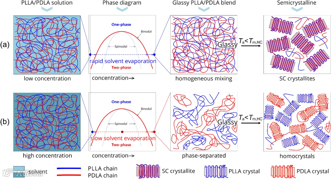 图3. PLLA/PDLA溶液采用不同挥发条件所制备样品冷结晶行为的原理框架图:(a)溶剂快速挥发形成均匀混合初始状态;(b)溶剂慢速挥发导致相分离初始状态。(注:图示非按比例绘制;图示中相图并非PLLA/PDLA溶液实际相图)