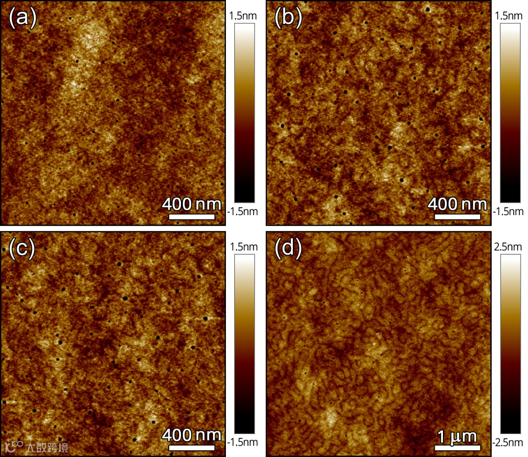 图2. 旋涂样品的AFM高度图(a-d旋涂条件依次与图1b-c中黑底A-D标示曲线所用条件相对应)