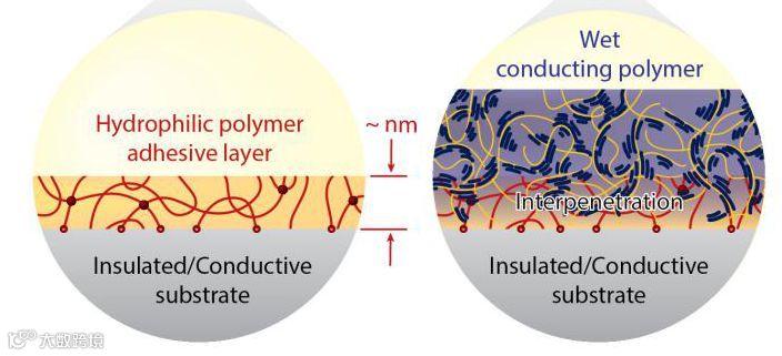 麻省理工学院机械工程系赵选贺教授团队最新发表在Science Advances上的研究论文(Strong Adhesion of Wet Conducting Polymers on Diverse Substrates, Science Advances 2020, 6, eaay5394 )报道了一种能够实现导电聚合物涂层与多种基底长期坚韧粘附的方法。该方法先对各类基底进行氨基功能化预处理,再通过旋涂、喷涂和浸涂等方法将亲水性聚氨酯(PU)涂附到基底上,形成纳米粘接层;纳米粘附层溶胀后可直接涂布导电聚合物水溶液(例如PEDOT:PSS等)或电化学聚合其单体溶液(如EDOT、吡咯、苯胺单体溶液等),在水性体系中形成聚合物分子互穿网络,以期实现粘接层粘附性能与导电聚合物电学、力学性能的完美结合。具体设计原理见图1。