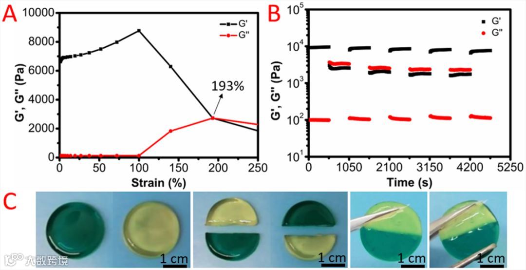 流变学研究表明,基于Knoevenagel缩合反应形成的C=C键在凝胶网络中可以发生快速的交换反应和易位反应。动态共价C=C键的存在使切开的凝胶能够在短时间内愈合,是一种可自修复水凝胶。