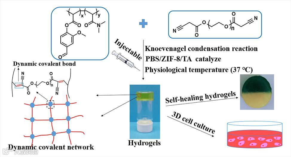 Knoevenagel反应在弱碱条件下可快速的进行,作者利用聚乙二醇二氰乙酸酯和水溶性聚醛为水凝胶前体,研究了在磷酸盐缓冲液(pH=7.4)、金属有机框架ZIF-8和三级胺等三种催化体系下制备的水凝胶,发现这些水凝胶都可以在很短的时间内形成,最短凝胶化时间为6s,是一种可注射水凝胶。