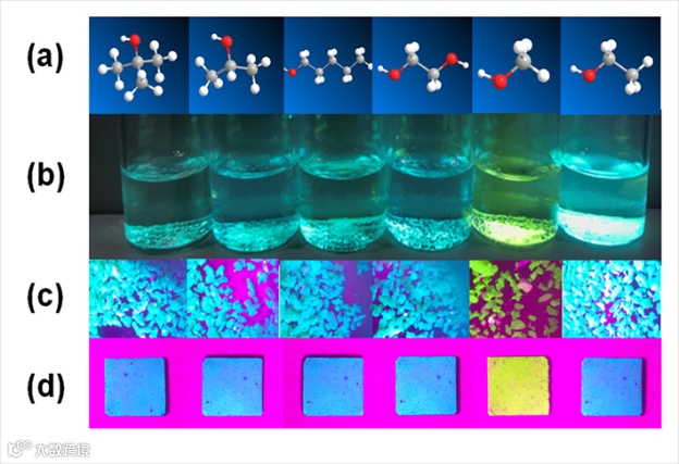 随后,选取不同醇类同系物进行比较,不管是溶液中还是气氛中,样品均只对甲醇能够选择性产生荧光响应。为了提高材料应用价值,将样品制成方形薄层,进行同样的醇类分子识别实验,结果依然能够对甲醇进行有效地检测,而其他醇类同系物中均未观察到现象。
