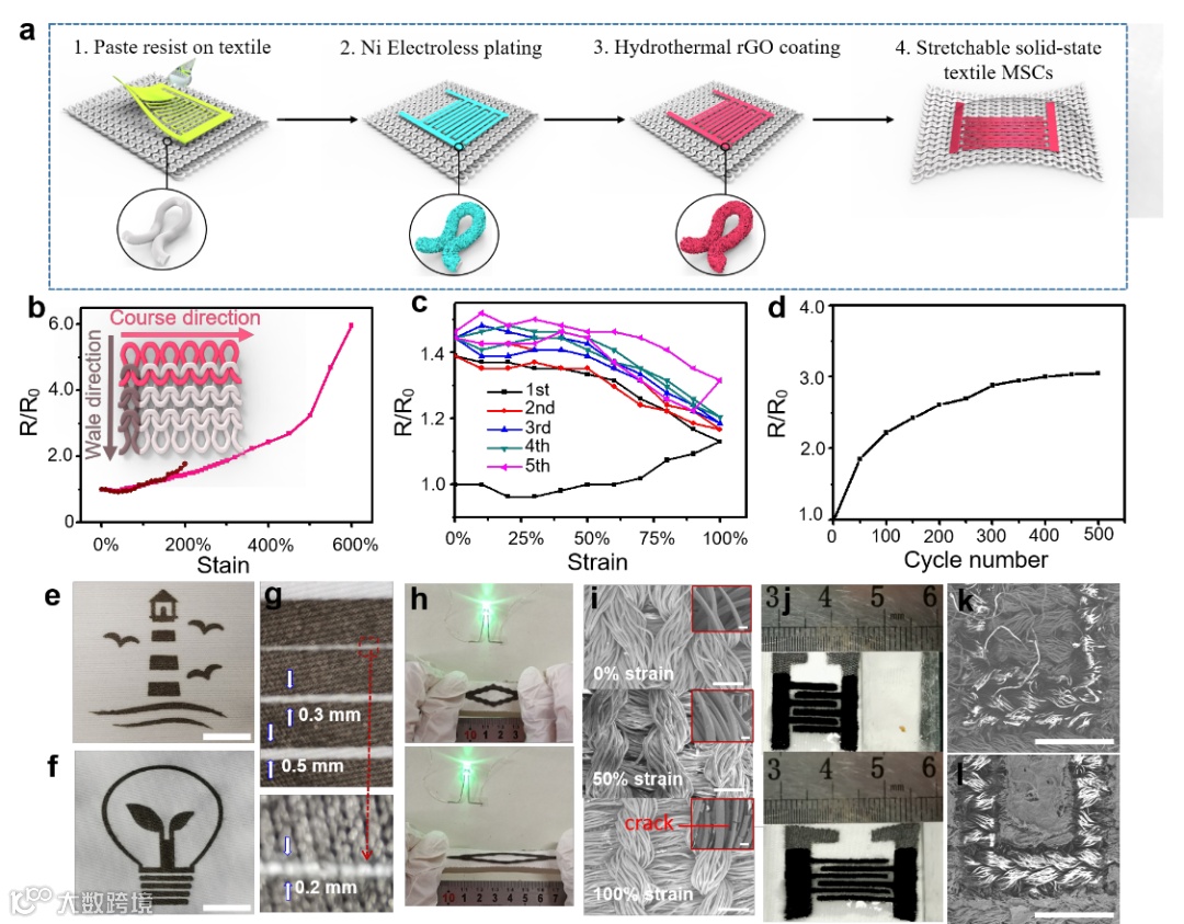 a)可拉伸织物电容器制备流程图。b,c,d)可拉伸导电织物的电学性能。e,f)织物导电图案。g)不同间隔的导电线条。h)导电织物作为导线时灯泡亮度。i)不同拉伸程度下导电织物的SEM照片。j)织物电容器实物图。k,l)覆盖rGO前后的SEM照片