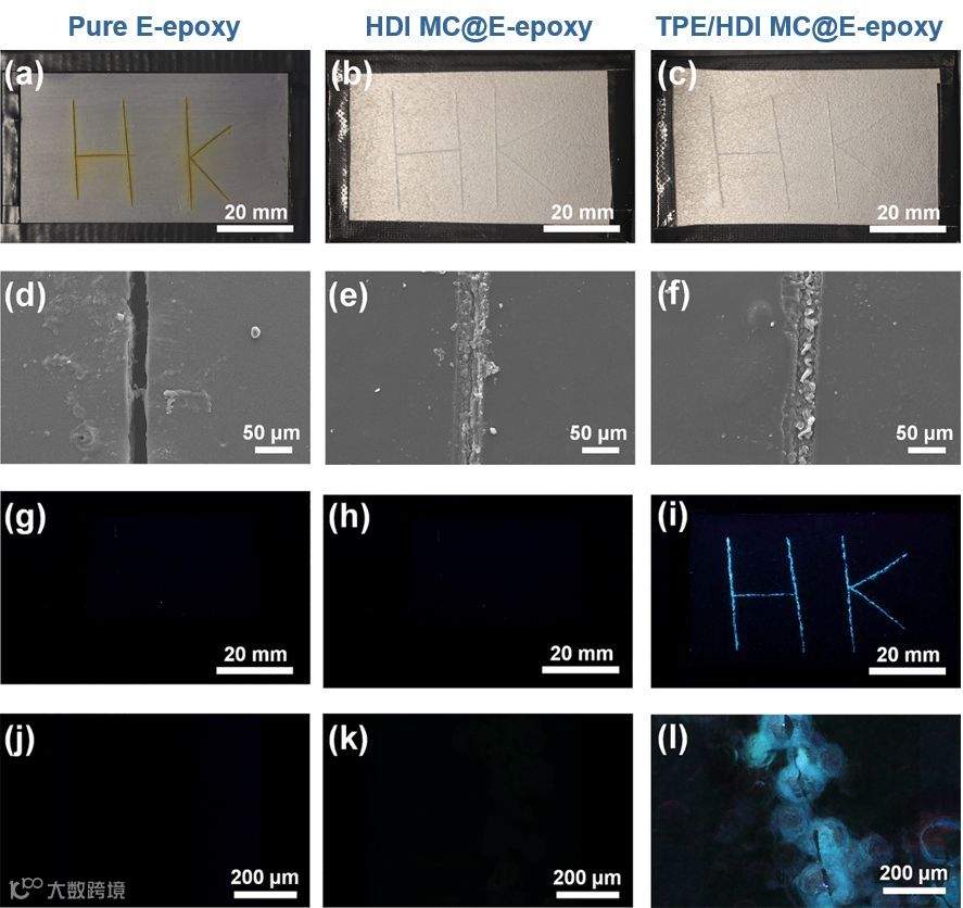 为了验证该策略的可行性,研究人员以四苯基乙烯(TPE)为例子,对比了只含HDI的微胶囊和含TPE/HDI溶液的微胶囊在完整状态和破坏状态下的发光行为。由图2可以看出,完整和破坏的HDI微胶囊,以及完整的TPE/HDI 微胶囊都不发光,只有破坏的TPE/HDI微胶囊发出明显的蓝色荧光。通过荧光显微镜可以进一步证实,单个完好的TPE/HDI微胶囊不发荧光,而当其被破坏后才发蓝色荧光。这些实验结果表明:含有TPE/HDI的微胶囊具有良好的损伤自预警功能。