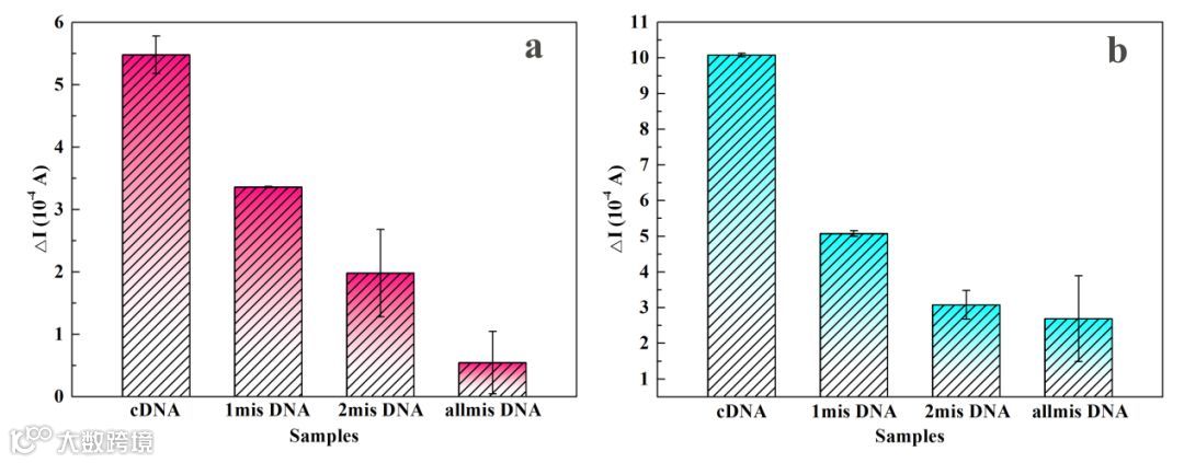 GCE/PPy/ZnO/pDNA(a)及GCE/PPy/ZnS/pDNA(b)对突变互补基因序列的探测