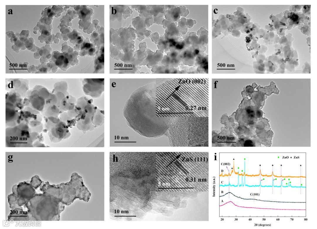 微波制备纳米颗粒的高倍透射电镜图与X射线衍射图(a,A)PPy,(b,B)MWPPy,(c,d,e,C),MWPPy/ZnO,(f,g,h,D)MWPPy/ZnS