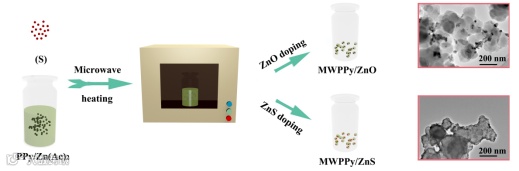 最近,江南大学任学宏教授与奥本大学张新宇教授研究小组共同探究了锌基复合纳米材料的制备并对其电化学性能进行深入研究。他们采用微波辐射加热技术,以导电聚合物聚吡咯(英文缩写为PPy)为基体,通过调控前躯体的种类及质量,短时间内(60 s)固-固反应生成聚吡咯/ZnO(英文缩写为MWPPy-ZnO),聚吡咯/ZnS(英文缩写为MWPPy-ZnS)纳米颗粒。进一步将得到的材料固定在玻碳电极(英文缩写为GCE)表面,实现对肿瘤DNA基因的有效探测。