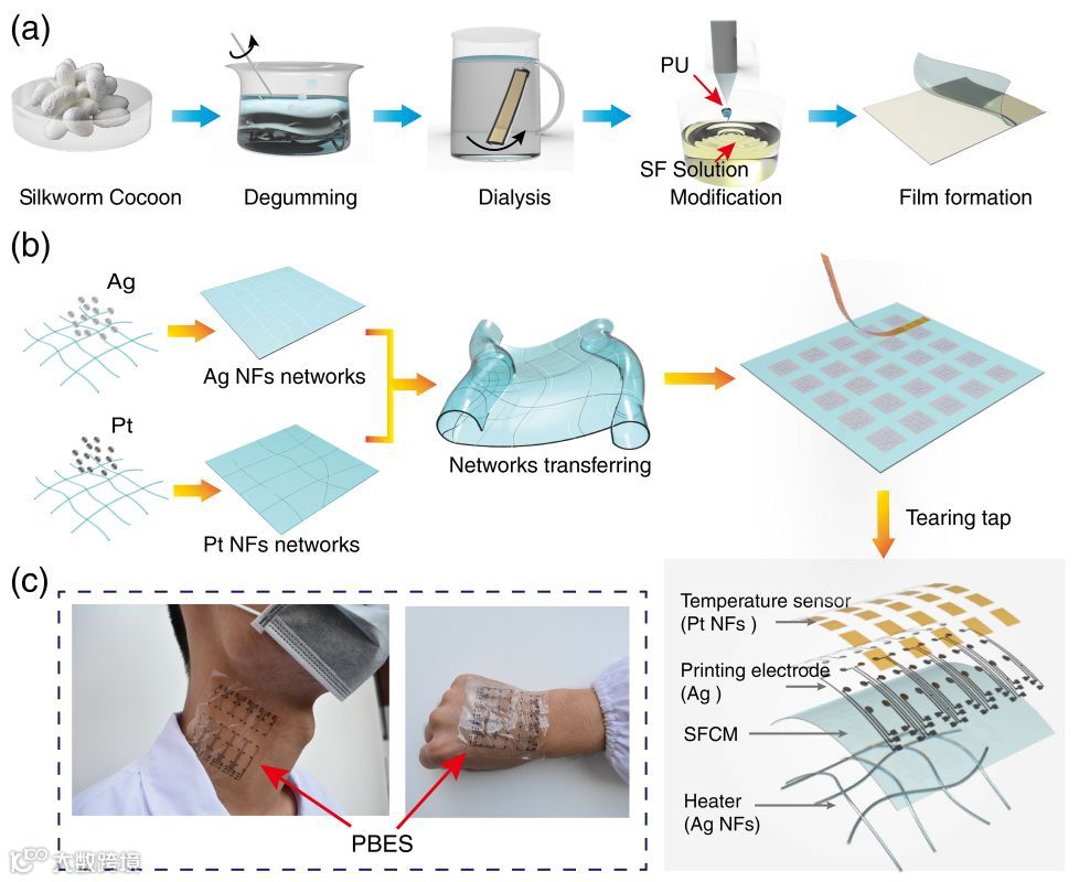 图1.(a)蚕丝复合薄膜的制备。(b)蚕丝基控温型电子皮肤的制备。(c)蚕丝基控温型电子皮肤贴附于人体脖子、手臂。