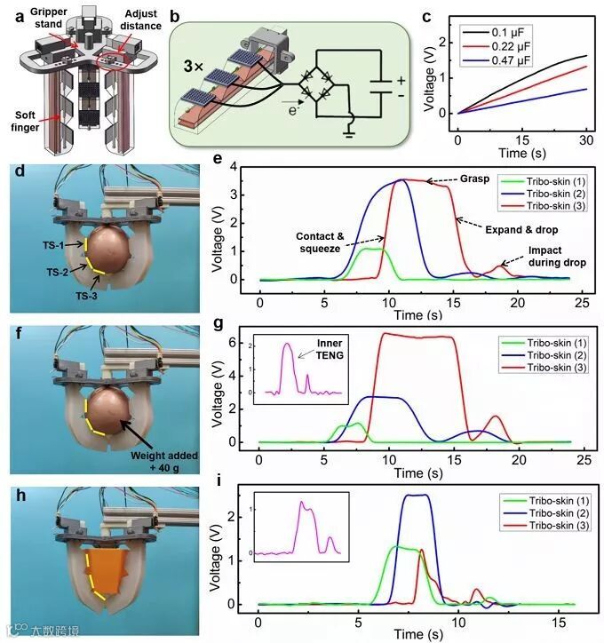 图5. 由三个执行器组装的智能软体机器手的综合性能。(a)软体机器手的设计示意图,其中三个指状执行器互成120°分布并安装在3D打印支座上。(b)基于摩擦起电皮肤能量收集系统的电路示意图。(c)使用不同电容的抓手充电曲线。(d)抓取塑料球体。(e)由三块摩擦起电皮肤产生的实时电压信号,体现了包括接触与挤压,抓取,张开与释放的过程。(f)抓取质量增加后的相同塑料球体。(g)由三块摩擦起电皮肤产生的实时电压信号包括内部摩擦纳米发电片的电压信号。(h)抓取空心六棱柱。(i)由三块TENG皮肤产生的实时电压信号以及内部TENG的信号。