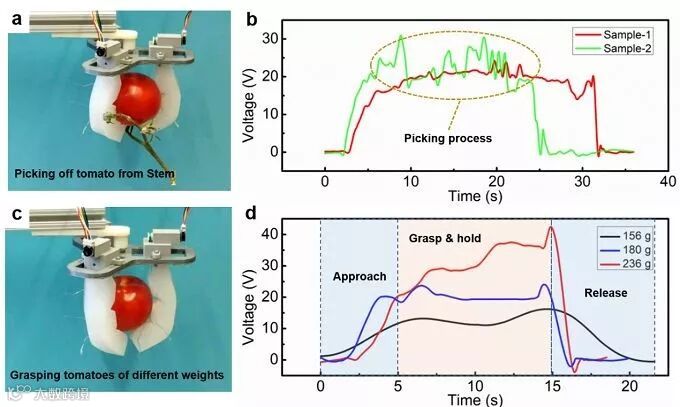 图6.智能软体机器手抓取并采摘西红柿的实验验证。(a)抓取位于茎秆上的西红柿。(b)采摘过程中,摩擦起电皮肤传感器产生的实时电压信号,包括接近、抓取与紧握以及释放过程的信号变化。(c)抓取不同重量的西红柿。(d)抓取过程中,摩擦起电皮肤产生的实时电压信号,验证其识别目标物体重量的能力。