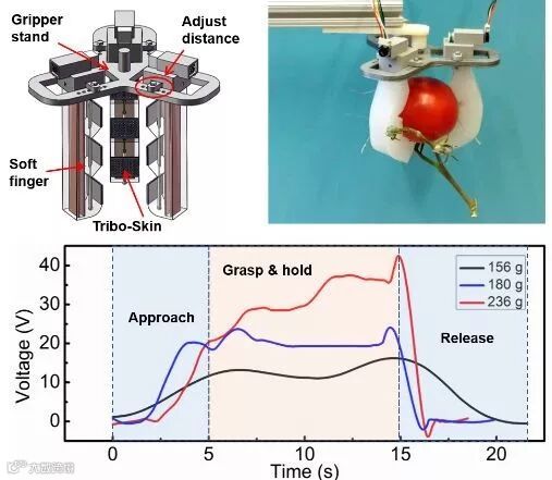 图1. 智能软体机器手通过摩擦纳米发电机(TENG)实现接触力以及弯曲程度实时信号监控和能量收集,可以实现果蔬采摘和筛选。