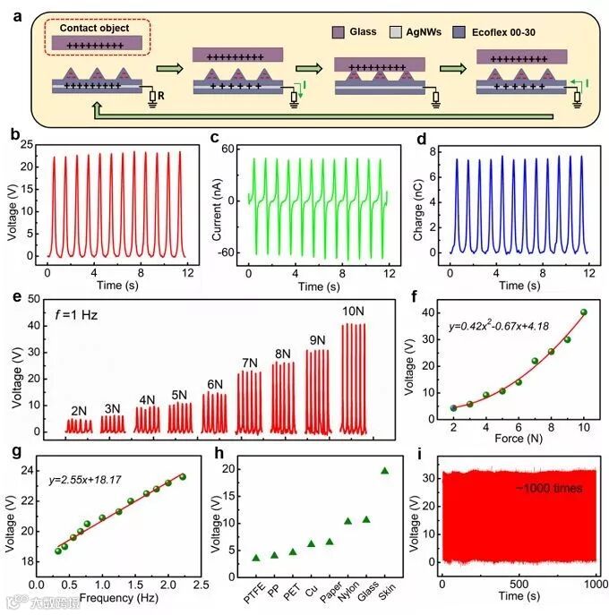 图4. 软体摩擦起电皮肤Tribo-Skin的工作原理及其性能。(a)摩擦起电皮肤的工作原理示意图:借助表面微型金字塔结构所表现出与接触面积以及挤压深度相关联的电压输出特性。8 N作用力以1 Hz频率挤压摩擦起电皮肤所产生的(b)开路电压,(c)电流以及(d)转移电荷。(e)不同幅值的挤压力使摩擦起电皮肤产生的开路电压大小(频率保持1 Hz)。(f)摩擦起电皮肤峰值电压与接触力大小的关系及相应拟合曲线(频率保持1 Hz)。(g)挤压频率与输出电压的关系(作用力保持7 N)。(h)摩擦起电皮肤的电压输出特性与不同接触材料相关。(i)摩擦起电皮肤稳定性测试结果。