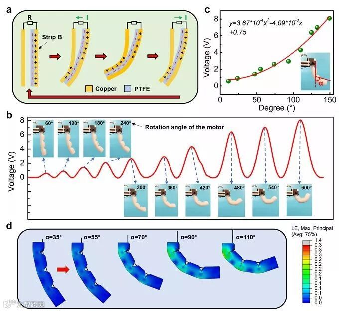 图3. 软体执行器内腔的摩擦纳米发电机TENG的工作原理及其性能。(a)内部摩擦纳米起电片的工作原理示意图:执行器的弯曲将会使得起电片B(与软体手指内腔贴合)与起电片A(与打印的手指支座相连)相接触并且两者接触面积会随着执行器弯曲程度增大而扩大。(b)内部摩擦纳米发电机片峰值电压与指状执行器弯曲程度(由直流马达转角大小衡量)的关系。(c)内部摩擦纳米发电机片峰值电压与指状执行器弯曲参数α(初末节指骨夹角)的关系以及相应的拟合曲线。(d)有限元分析得到的软体执行器在不同弯曲程度下的应变分布。
