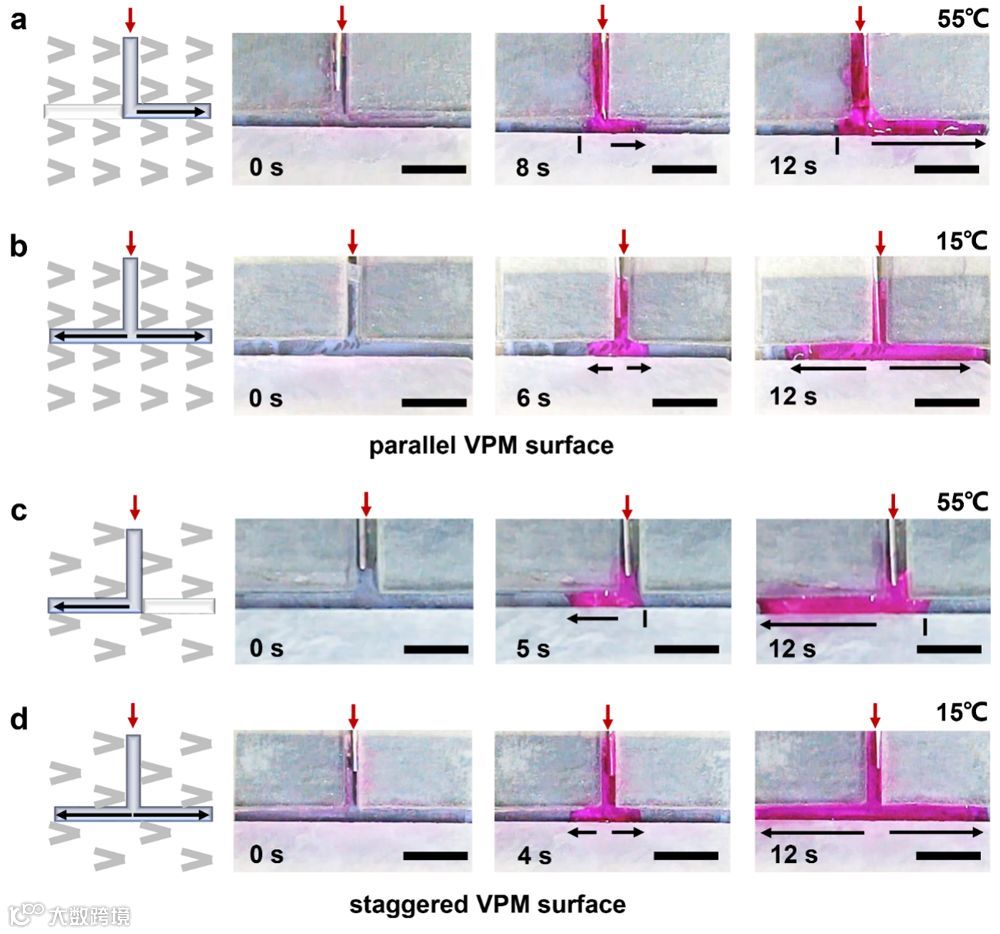 图3. 不同温度下,温度响应VPM表面的动态浸润行为。(a,b)平行结构。(c,d)交错结构。当55℃时, 液体在(a)平行和(c)交错结构VPM表面呈现方向相反的各向异性润湿。当15℃时,液体在(b)平行和(d)交错结构的VPM表面都呈现各向同性润湿。