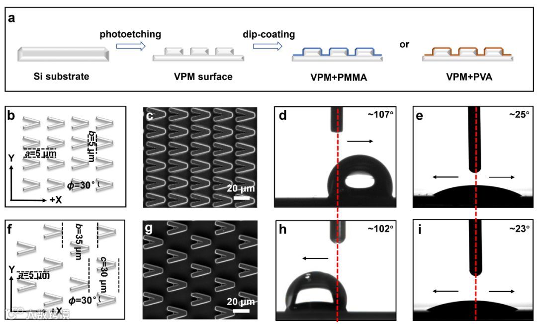 图1. 各向异性的V阵列(VPM)表面对液滴的定向浸润。(a) 涂覆PMMA膜和PVA膜的VPM表面制备示意图。(b-i) 不同结构VPM表面的浸润行为:(b-e)平行结构和(f-i)交错结构的示意图、SEM图像、涂覆PMMA膜和涂覆PVA膜的接触角(CA)照片。