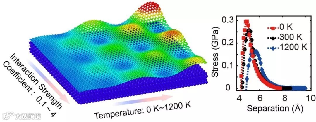 该团队通过分子尺度模拟和理论分析,发现软物质薄膜与基体材料的黏附行为与温度相关,这与传统的力学理论有所差异。薄膜材料在垂直表面方向缺少束缚,因此表面存在褶皱。研究人员首先以二维材料石墨烯为研究对象,发现当薄膜与基底相互作用时,其表面波动的幅值与温度成正比,与基底作用强度的1/2次方成反比。这一表面形貌的变化,即为导致粘附行为改变的原因。进一步的分析发现,薄膜与基底材料相互作用强度与温度成线性关系。当温度升高时,表面波动更为剧烈,薄膜与基底材料的粘附强度减弱,但相互作用范围相应增大,如图片所示。
