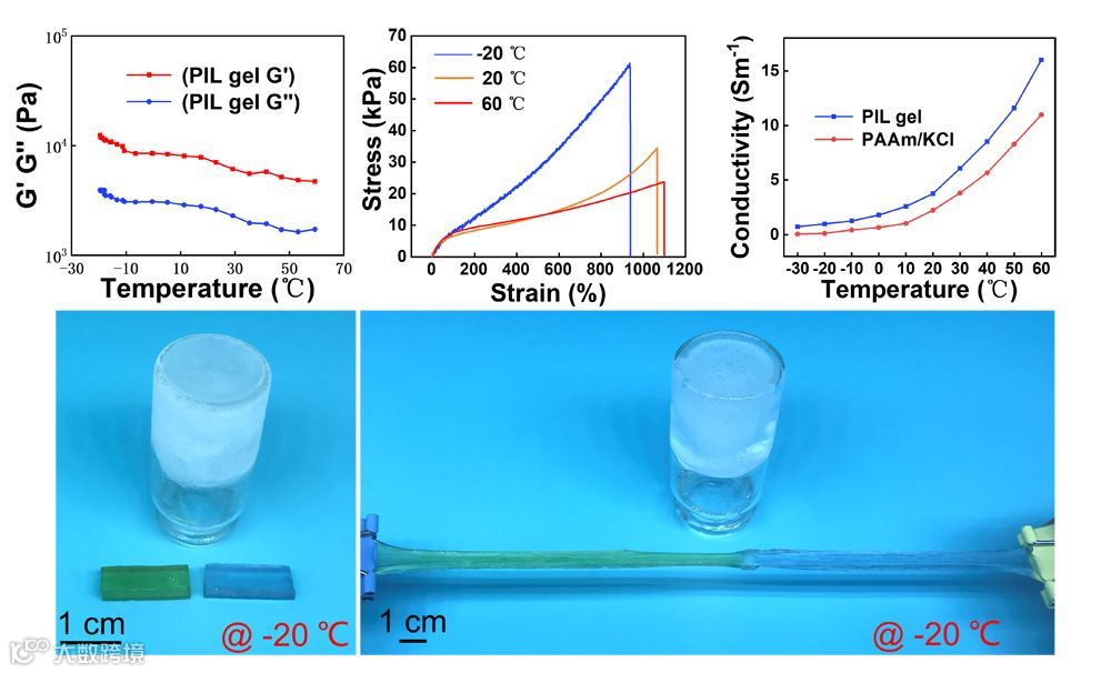 图2. 聚离子液体水凝胶在低温下的流变、拉伸、电导率和自修复测试。