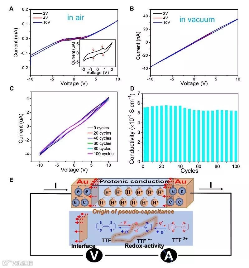 基于此,他们在本文中提出了新颖的“离子导电/赝电容耦合”机理,解释了二维金属有机框架材料与金属电极界面上的电荷转移过程,这一机理为后续导电配合物多孔材料和器件的设计提供了理论指导意义。该类同时具备有效的质子和电子传导的二维配合物材料可应用于新型功能电子器件、神经形态以及能源转化或存储器件中。