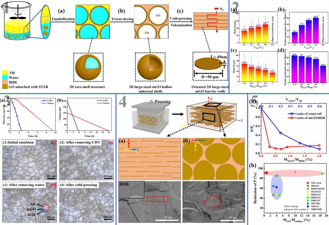 最近,该团队利用双亲性的改性氧化石墨烯(mGO)在溴化丁基橡胶(BIIR)油溶液成功构建了3D核(水)-壳(mGO)结构;通过冷冻干燥技术除去了油和水,得到了3DmGO空壳结构;最后通过冷压将其压成了取向二维(2D)大尺寸的mGO阻隔片(直径约为50-120 μm,厚度约49 nm);在低的石墨烯含量下实现了BIIR气体阻隔性能的显著提高。