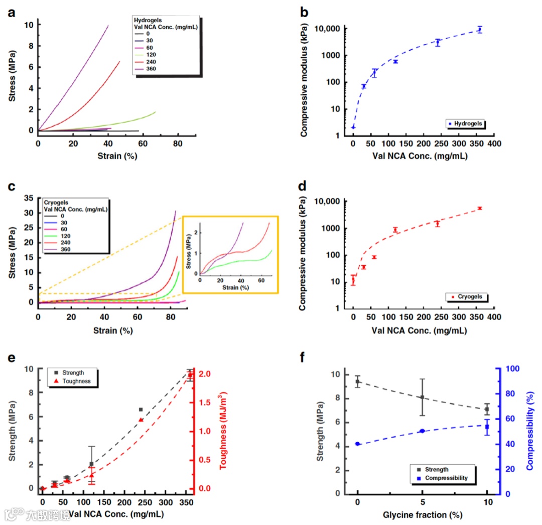 图2. 富含肽β-折叠的复合材料的力学性能。使用不同浓度的Val NCA单体浓度获得的材料:a,c)分别为水凝胶和冷冻凝胶的压缩应变-应力曲线;b,d)分别作为Val NCA单体浓度的函数的水凝胶和冷冻凝胶的压缩模量(刚度);e)水凝胶的强度和韧性;f)富含甘氨酸的水凝胶的强度和断裂压缩(可压缩性)。