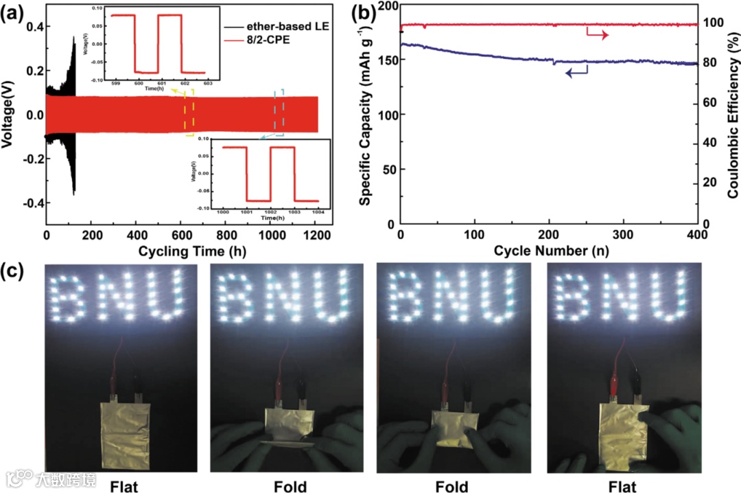 图4.(a)8/2-CPE和醚类液态电解质的锂-锂电池的循环曲线;(b)在40 ℃、0.5 C时LiFePO4|8/2-CPE|Li电池的循环性能;(c)LiFePO4|8/2-CPE|Li软包电池演示电池形变时的安全性能。