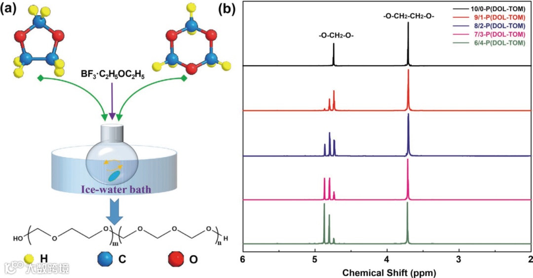 图1.(a)DOL和TOM阳离子开环聚合反应机理;(b)不同摩尔比的DOL和TOM单体共聚得的系列共聚物的核磁共振氢谱。