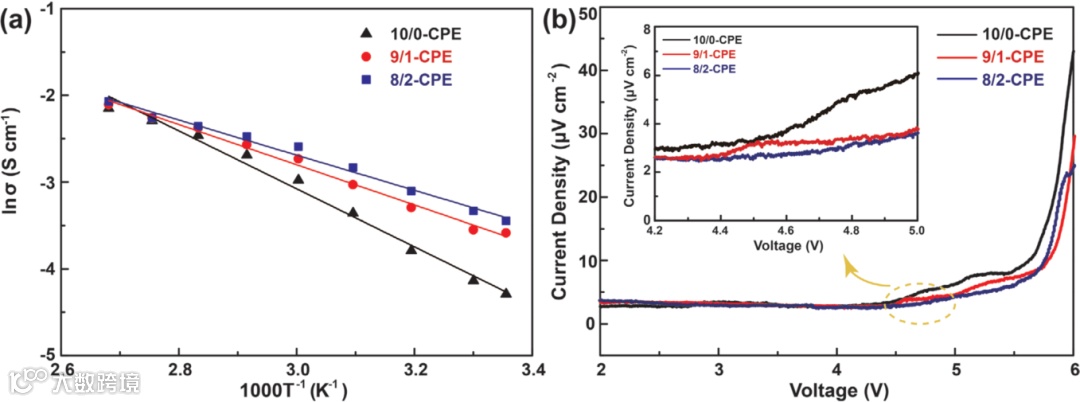 图3.(a)10/0-CPE、9/1-CPE和8/2-CPE的离子电导率和温度的关系曲线;(b)10/0-CPE、9/1-CPE和8/2-CPE的电化学稳定窗口。