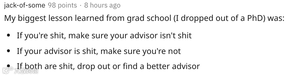 这似乎也符合国内情况:实验室老旧项目不出成果,导师又不许自研只让你打工,对你的论文含糊其辞一拖再拖,很多满怀科研热情的博士生都是这样被废掉的。