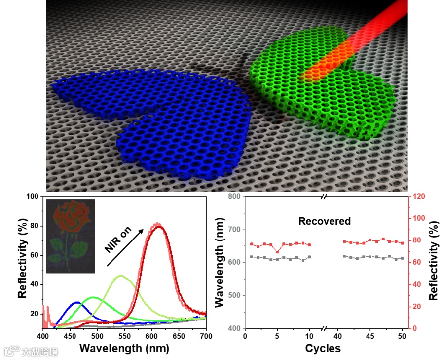 研究团队将光子晶体反蛋白石多孔结构设计到共价交联的聚苯乙烯/聚丙烯酸正丁酯形状记忆材料中,得益于聚苯乙烯/聚丙烯酸正丁酯形状记忆材料较宽的玻璃化转变温度(从47~105 ℃),该材料可拥有多个临时形状,且均能在室温稳定维持。采用近红外光照射(光热效应),即可实现形状记忆光子晶体材料临时形状在纳米尺度上的快速精准回复,由此改变光子晶体晶格间距,从而带来肉眼可见的颜色变化。而且,通过改变光照时间便可控制形状回复程度,进而可以程控颜色变化。值得强调的是,利用近红外激光可在同一张形状记忆光子晶体薄膜上直写出多种色彩(红绿蓝等),在反复擦写50次以上仍保持优异性能;同时,利用激光还可以将A4纸上的黑色图案彩色复印到形状记忆光子晶体薄膜上,复印下来的信息可以在室温下稳定保持超过一年。