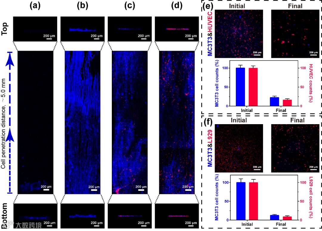 图3. (a)control支架和(b)WHP支架内MC3T3-E1(蓝色)细胞迁移情况;WHP支架中MC3T3-E1(蓝色)细胞与(c)HUVEC(红色)或(d)L929(红色)细胞共迁移情况。细胞培养皿中(e)MC3T3-E1细胞与HUVEC和(f)MC3T3-E1细胞与L929细胞共迁移前后的细胞量