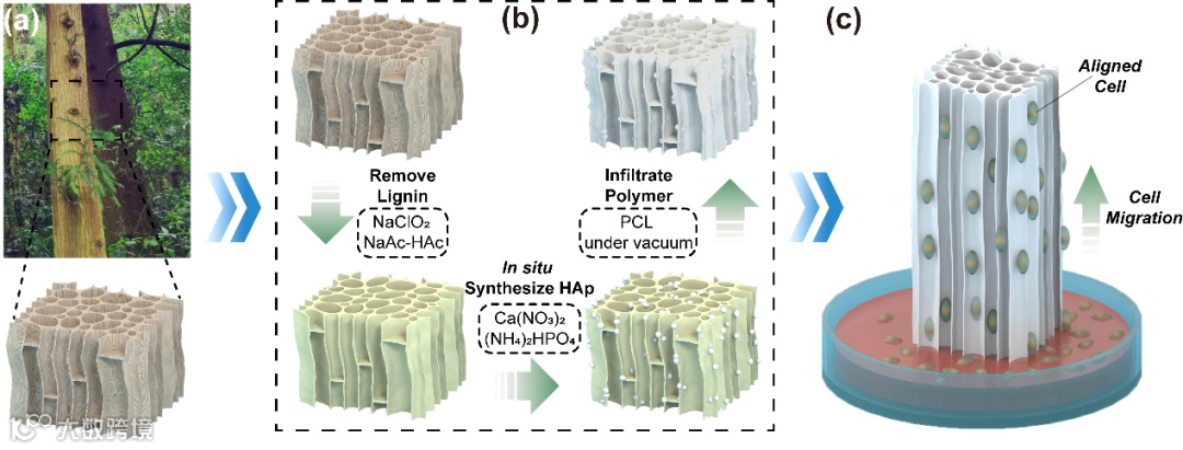 取向结构在血管、肌肉组织和骨骼等生物组织和器官中具有独特而重要的功能,促进了营养物质的转运、细胞的迁移与排列。例如,在骨骼中存在的从微观到宏观的取向结构赋予了其独特的力学支持功能,它的各向异性特征和多孔结构赋予了骨优异的细胞增殖、定向迁移和原位血管化能力。而在自然界中,也存在许多具有类似独特结构的天然材料。木材就是一类典型的具备各向异性和多级结构的天然材料,它具有沿排列方向运输液体、在互连的介孔结构中进行物质交换的特性。木质材料因其力学性能和物质交换能力而得到了广泛的研究,但在生物领域的应用仍然具有挑战性。