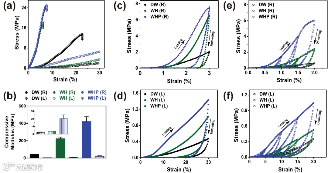 图3.不同支架不同方向的(a)压缩力学性能曲线;(b) 压缩模量;(c)(d) 循环压缩曲线;(e)(f)递进压缩曲线。