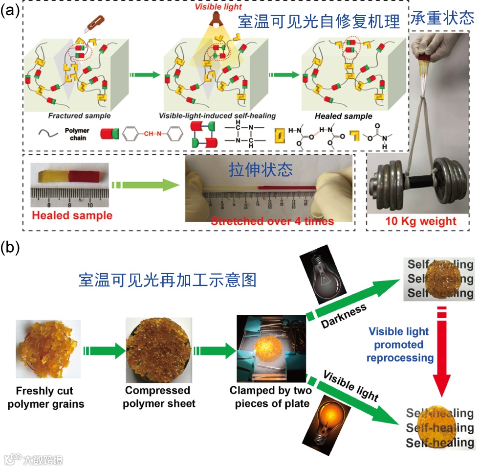 图1.(a)含动态ASB键水性聚氨酯的室温可见光自修复机理和修复样品的拉伸及承重;(b)含动态ASB键水性聚氨酯的室温可见光再加工示意图